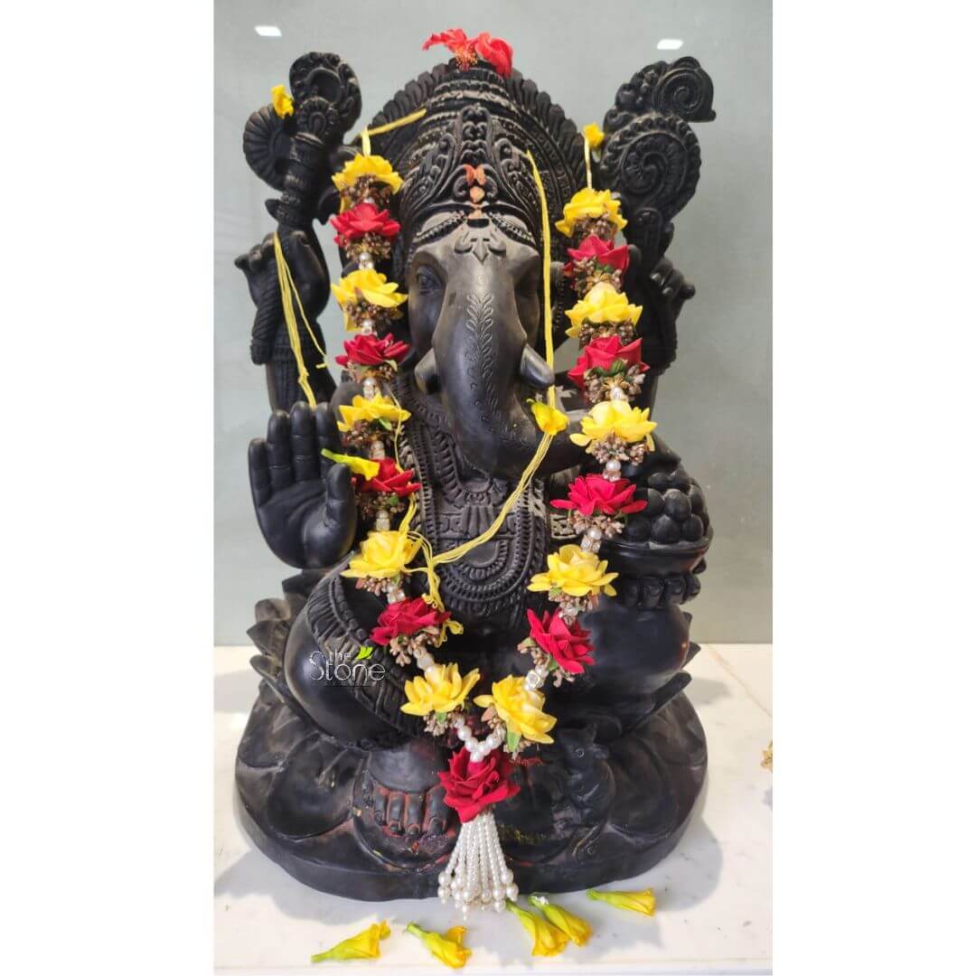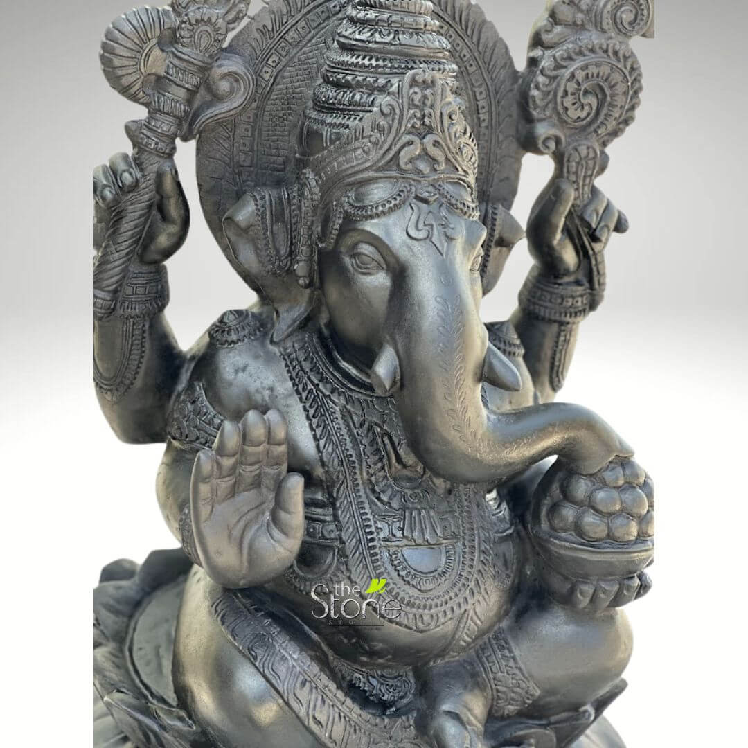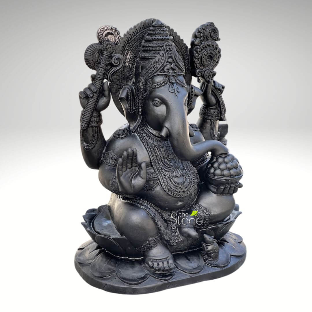 This beautifully handcrafted 30 inch Ganesha statue is carved from high-quality black stone, showcasing the divine presence and intricate artistry of Lord Ganesha, the remover of obstacles and bringer of prosperity.