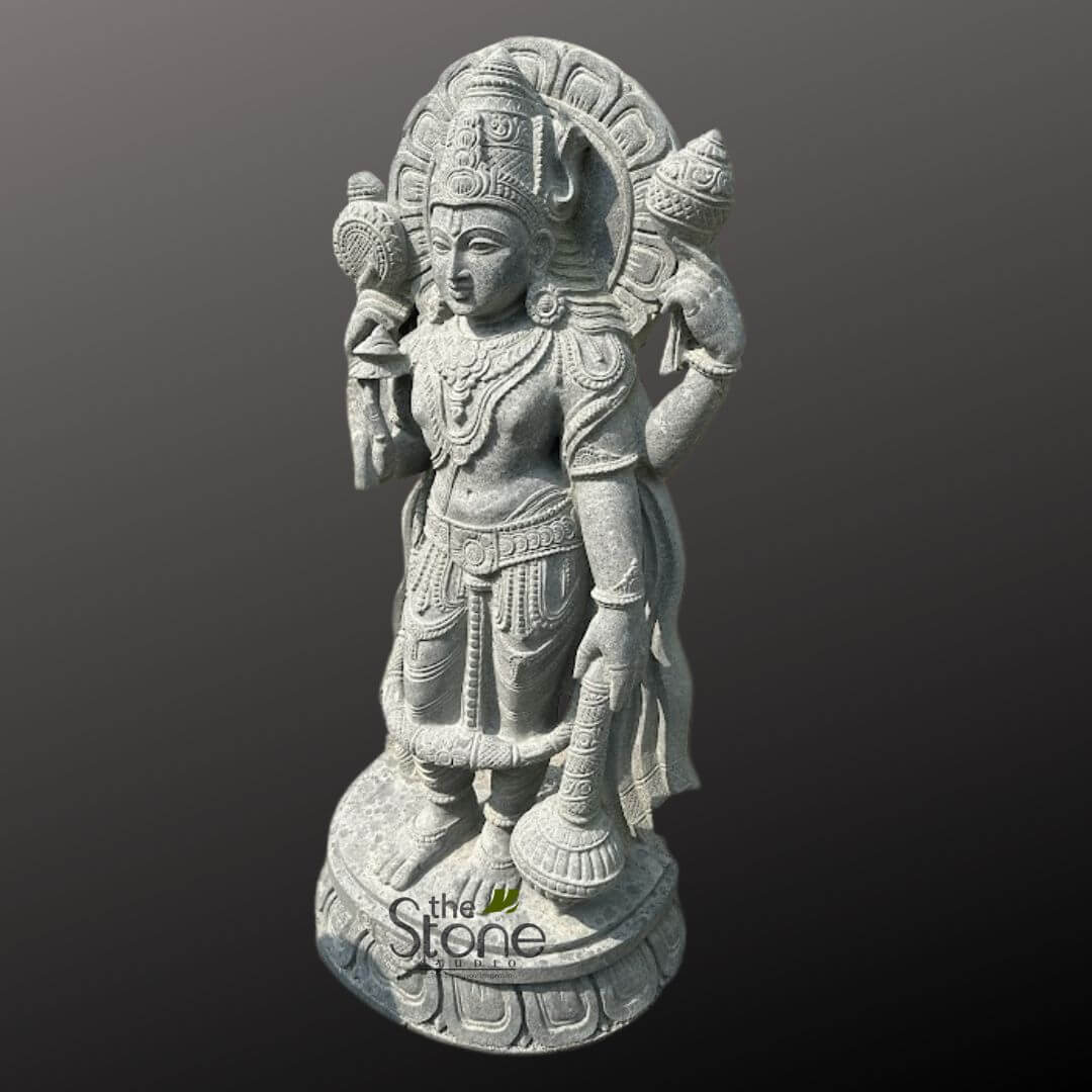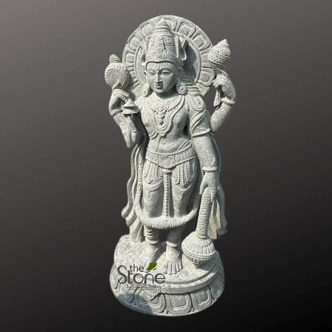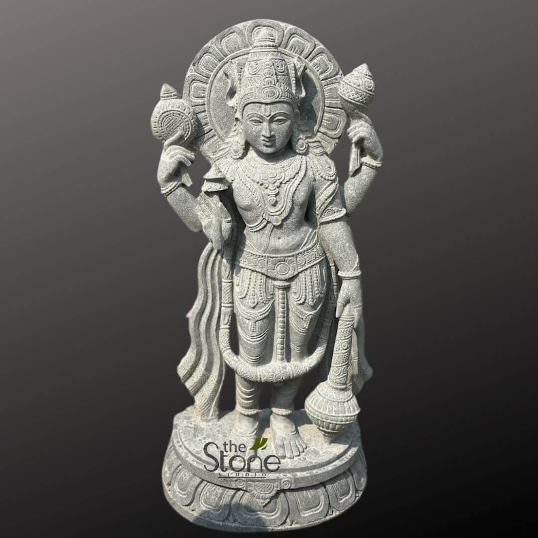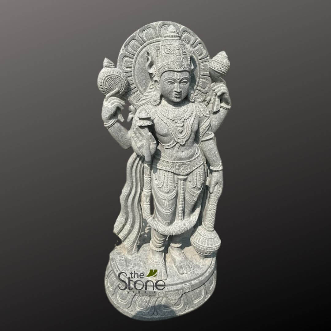- Hand-carved from durable grey stone, it features Vishnu in his iconic four-armed form, gracefully holding the Chakra, Shankha, and Gada.