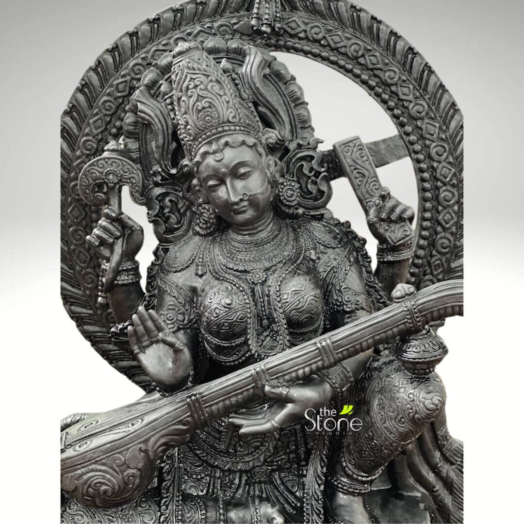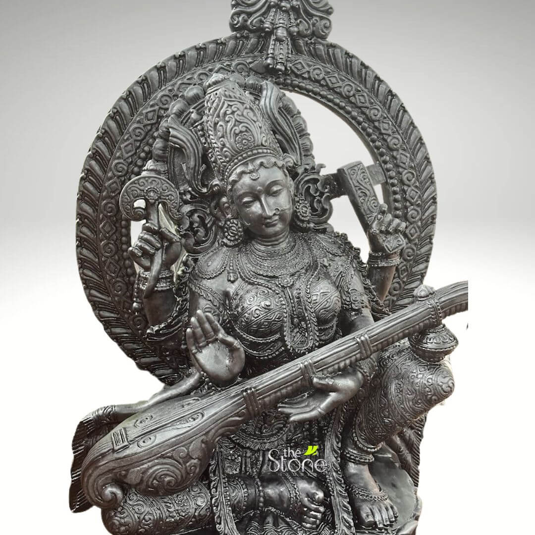 - 5-feet Maa Saraswati black stone statue, hand-carved and richly detailed; the goddess sits serenely on a lotus pedestal within an ornate prabhavali crowned by kirtimukha.