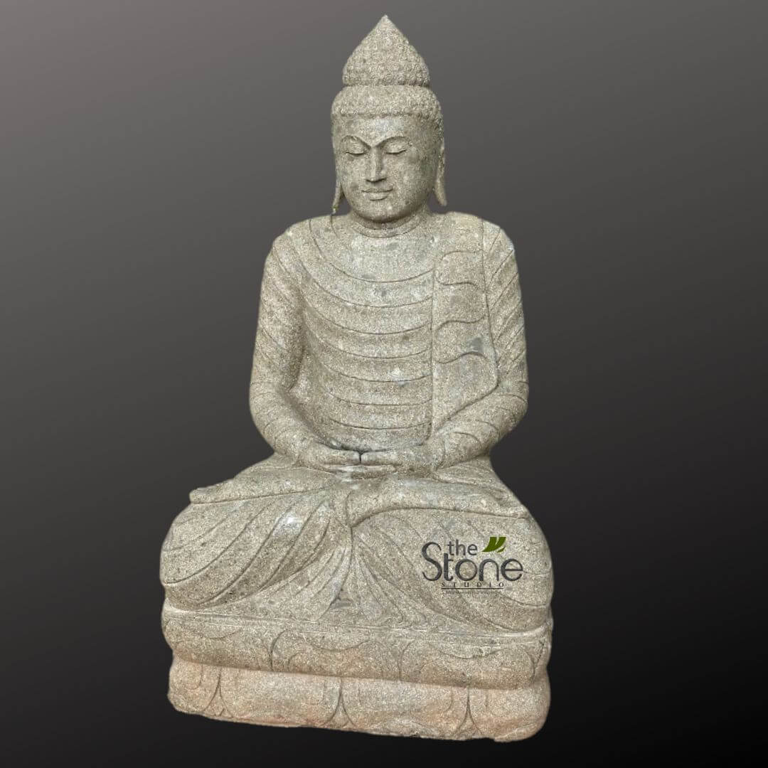- The Buddha sits serenely in the full lotus position, known as padmasana, with his feet gracefully turned skyward and his hands resting in the serene dhyana mudra, a gesture symbolizing deep meditation.