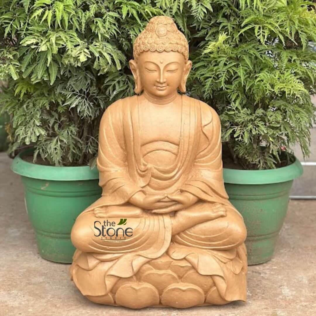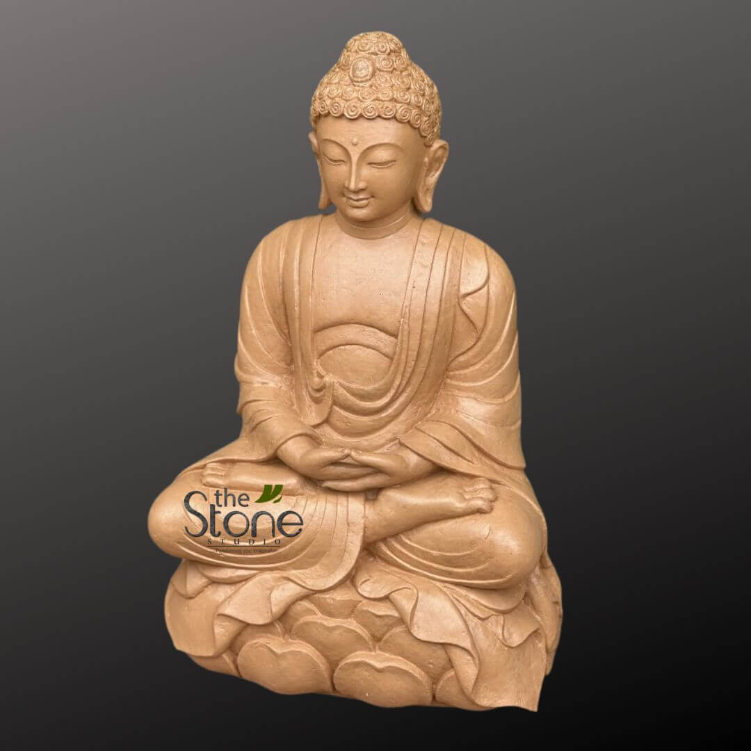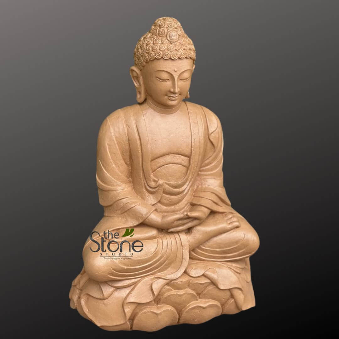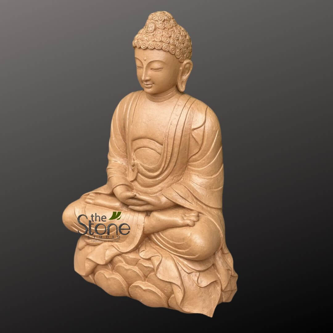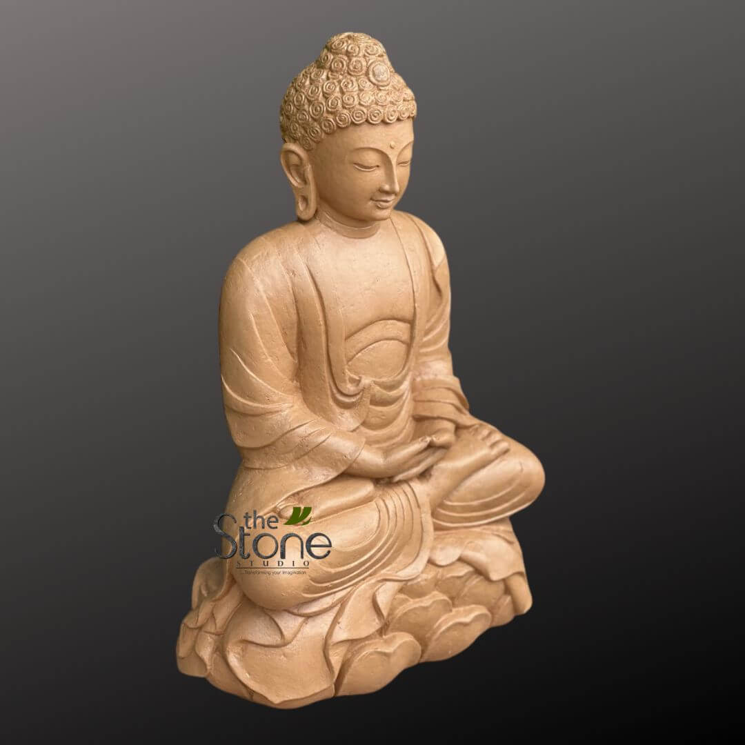 Sculpted with fine detailing, the statue features Buddha in a meditative posture seated on a lotus base, symbolizing enlightenment and inner harmony.