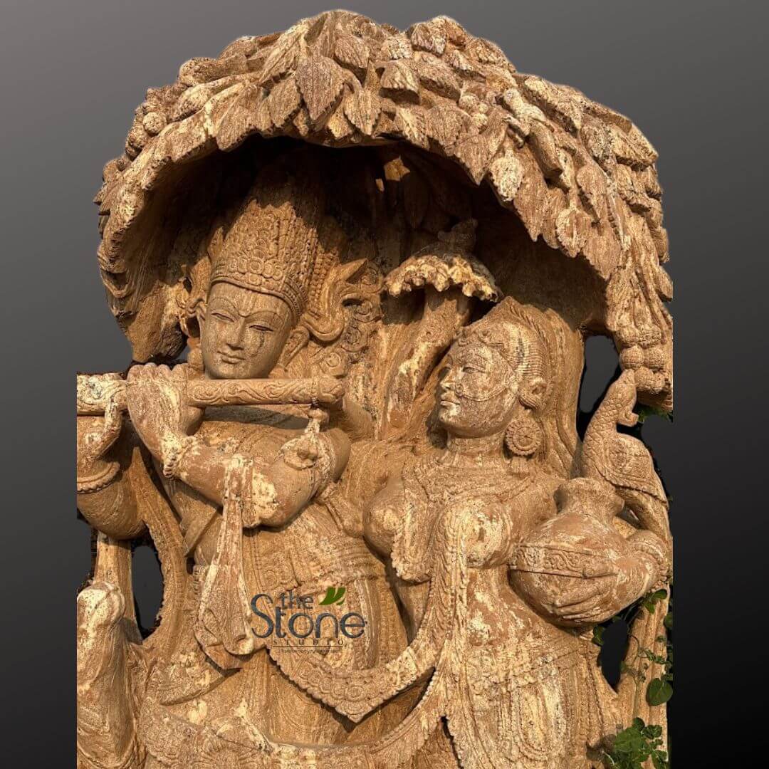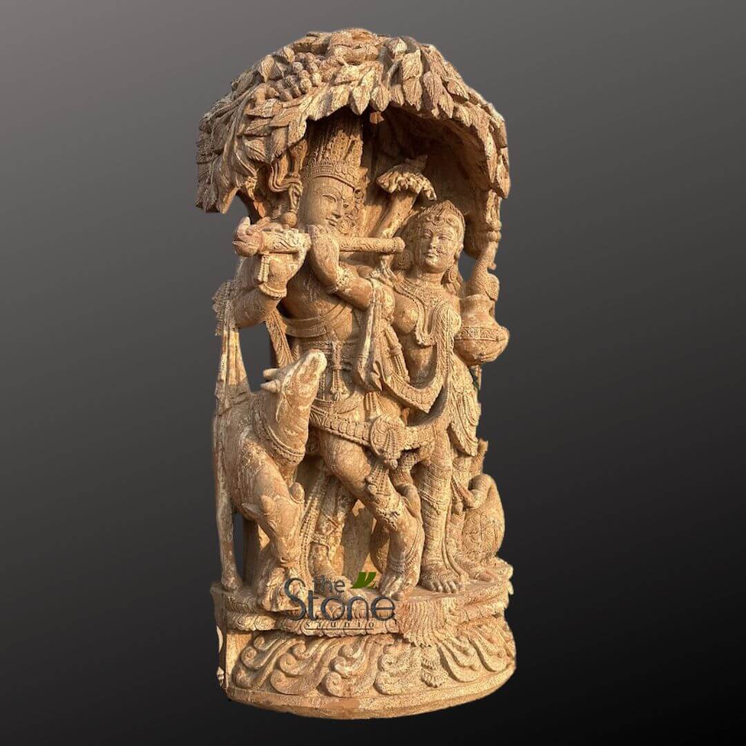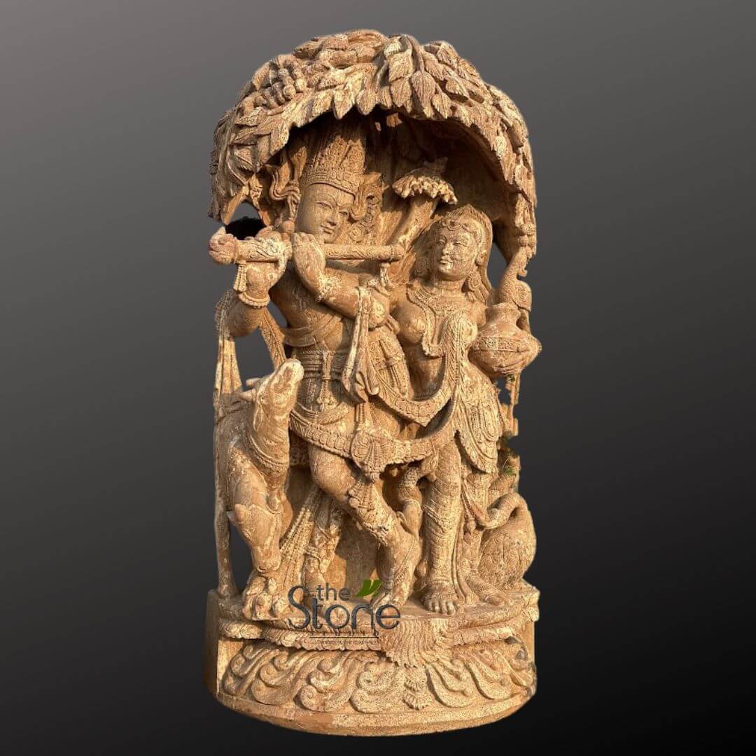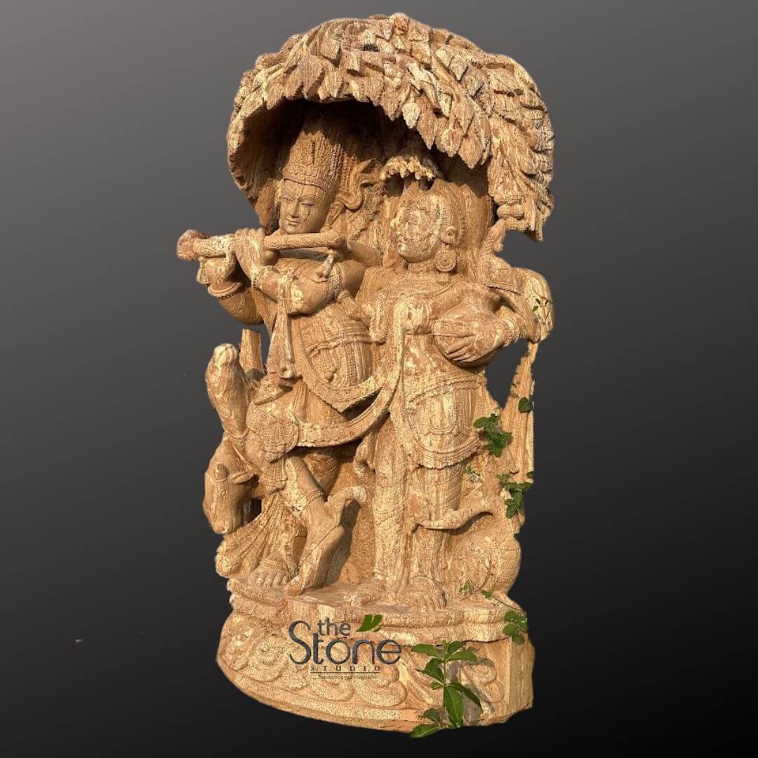 The material used in it is Sand Stone. This sculpture is wonderfully crafted by our best artisans. For more such statues browse our website. If you still don’t get what you want, our artisans will craft your specified designs of the Radha Krishna sculpture standing under a tree with utmost care and love.